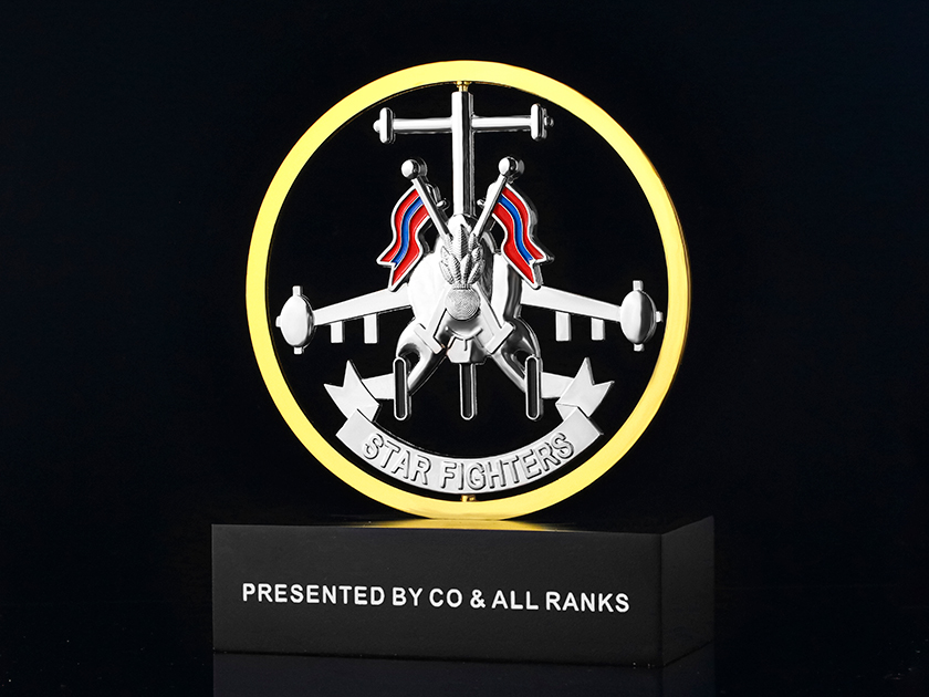 【制作工藝】:壓鑄 【上色工藝】:金屬本色 【電鍍顏色】:雙色 【背面工藝】:亮面 【產(chǎn)品配件】:木底座