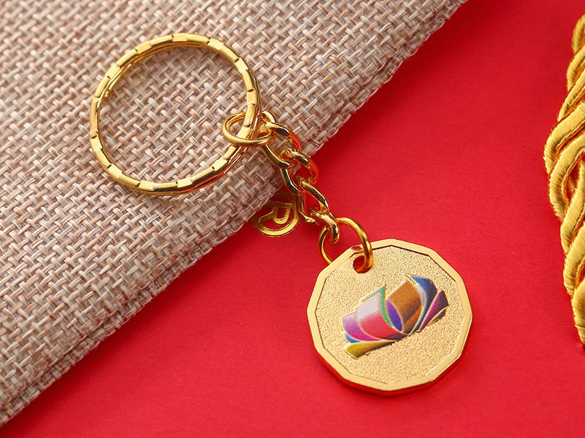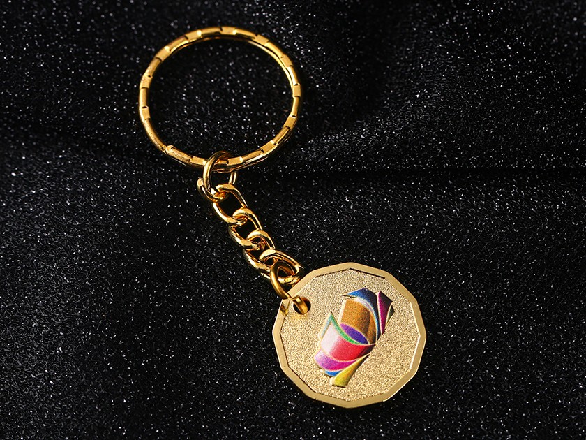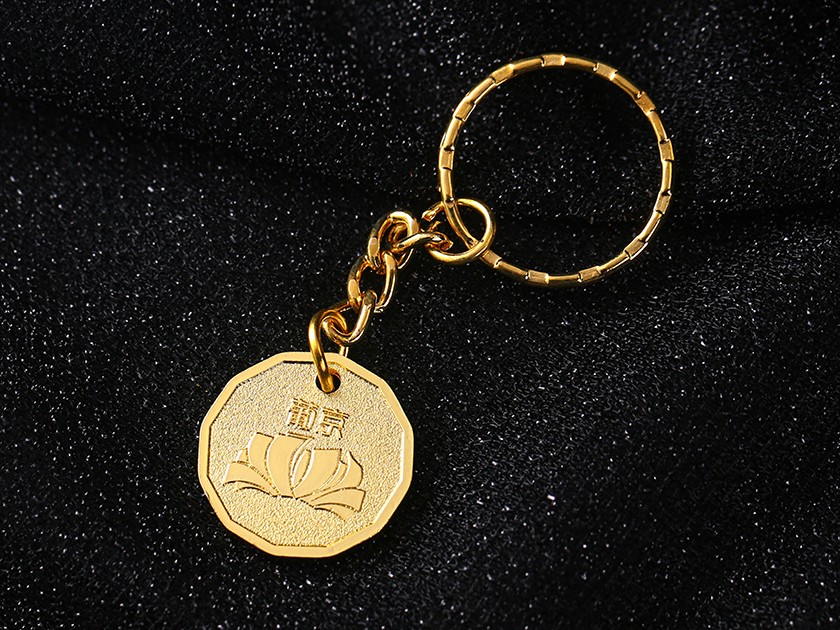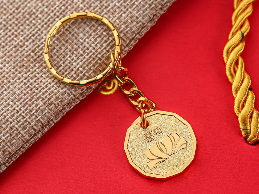 【制作工藝】:沖壓 【上色工藝】:彩噴 【電鍍顏色】:金色 【背面工藝】:砂底 【產品配件】:條紋圈+鏈條